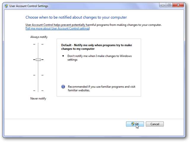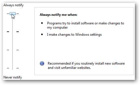 Topindstillingen er den absolut mest sikre, og hvordan UAC fungerede i Windows Vista. Det giver dig besked, når der foretages ændringer på din computer, herunder ændring af Windows-indstillinger.