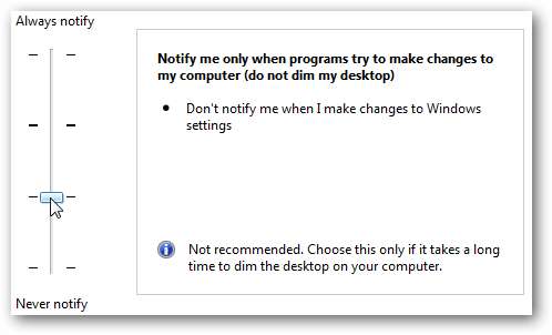 Trinnet ned fra Windows 7-standardindstillingerne ligner standardindstillingerne i Windows 7, men dæmper ikke skrivebordet, når en UAC-prompt kommer op. Dette kan gøre dit system mindre sikkert, da nogle ondsindede programmer automatisk kunne godkende UAC-prompten, når den er i denne tilstand.