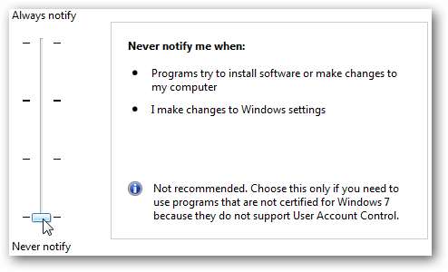 Eller hvis du aldrig vil se en UAC-prompt, kan du vælge den laveste indstilling. Dette efterlader dine systemindstillinger svarende til Windows XP, som aldrig beder om, når der foretages ændringer eller programmer installeres. Vi anbefaler ikke denne indstilling, men den er tilgængelig, hvis du vil have den. Hvis du vælger at slå UAC fra, finder ændringerne ikke sted, før du har genstartet computeren.