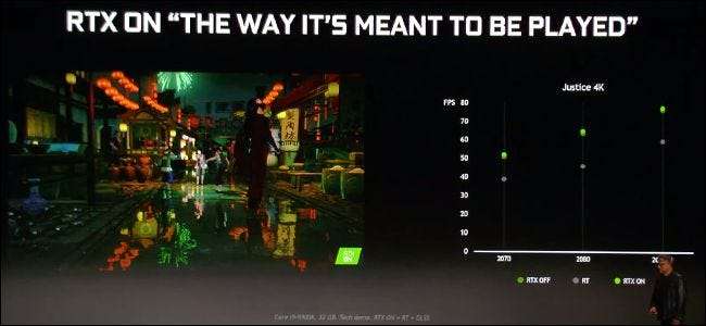 Brug af de forudberegnede forbedringer af DLSS, som RTX GPU'erne i NVIDIAs datacentre allerede har knust, kan udjævne ydelsen af RTX-aktiverede spil. I sin CES-demonstration blev et spil med strålesporing og DLSS begge aktiveret spillet inden for en ramme eller to af spillet, der kørte uden nogen strålesporing aktiveret overhovedet. For at sige det så enkelt som muligt: DLSS gør det muligt for spil at køre meget hurtigere med mere fancy lyseffekter.