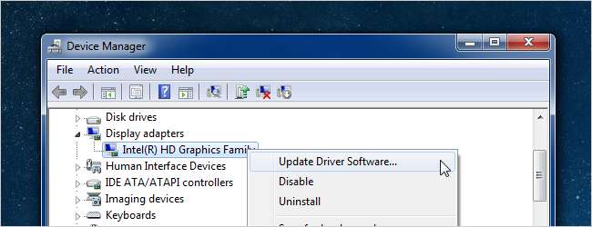 Hvis du har et problem med en bestemt enhed, kan du hurtigt opgradere til en nyere version ved at åbne Enhedshåndtering, højreklikke på enheden og vælge Opdater driversoftware.