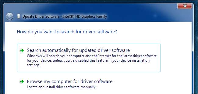 Dette viser en guide, der lader dig enten søge i Windows Update eller din pc efter de nyeste drivere - eller du kan installere driverne manuelt ved hjælp af indstillingen Gennemse.