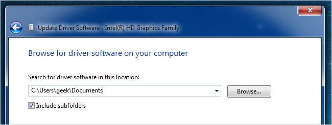 For det meste, når du downloader drivere fra et sted som NVidia eller AMD / ATI, vil de have en hel driverinstallationsguide inkluderet i downloadet, så du skal bare køre det for at opgradere driverne til den nyeste version. Hvis du tilfældigvis finder en driver (måske til en enhed, der giver dig en fejl), der er i en zip-fil, kan du bruge guiden på skærmen ovenfor og vælge Gennemse indstilling. Dette viser et vindue som dette, hvor du kan angive den mappe, som du har pakket driverne ud til.