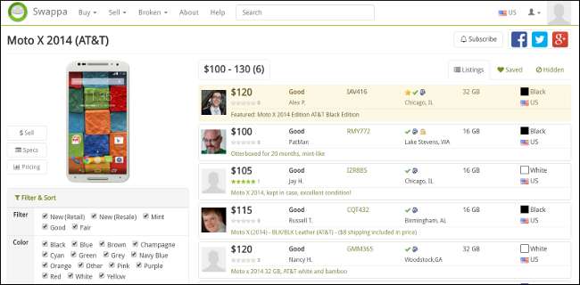 For eksempel kan du sælge en iPhone næsten hvor som helst, men Android-telefoner er lidt hårdere. Swappa er efter min erfaring det bedste sted at sælge telefoner - deres database gør det let at sælge den nøjagtige model, du har, det er let at finde ud af, hvad din telefon er værd, og der er ingen gebyrer. I stedet for at tage en procentdel af dit salg opkræver de et fast gebyr på $ 10 til købere - hvilket betyder, at du ikke mister et ton penge, som du gør med eBay eller Amazon.