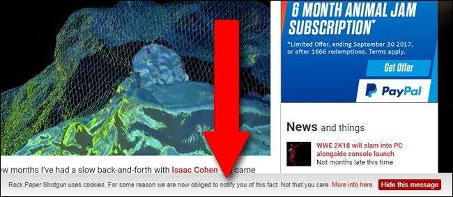 De fleste webstedsadministratorer og indholdsskabere ser ud til at betragte de obligatoriske advarsler om cookies som en gener og spild af tid. Det er som et sikkerhedskamera, der skal sprænge "Jeg ser dine bevægelser nu!" på en højttaler, hver gang du går forbi. Ja, cookies kan bruges til at gøre nogle ret skyggefulde ting med dine oplysninger på internettet, men de er også en ret grundlæggende del af, hvordan selve internettet fungerer nu. At tvinge brugere til at se og anerkende en advarsel på næsten ethvert websted, der er hostet i EU, virker overflødigt og helt nytteløst.