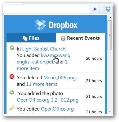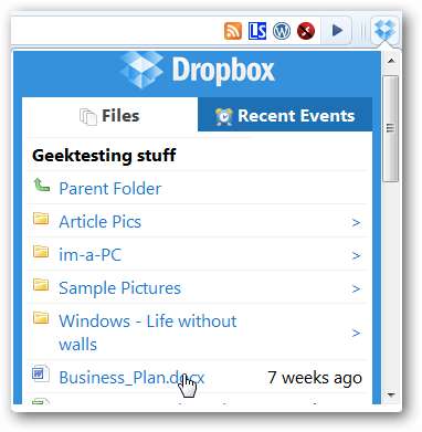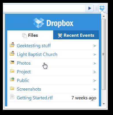 Jetzt sehen Sie alle Ihre Dropbox-Dateien und -Ordner direkt dort im Überlagerungsmenü in Chrome.