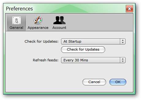 Im Bereich "Allgemein" können Sie festlegen, dass ReadAir beim Start auf Aktualisierungen überprüft und der Zeitpunkt für die Aktualisierung Ihrer RSS-Feeds festgelegt wird.