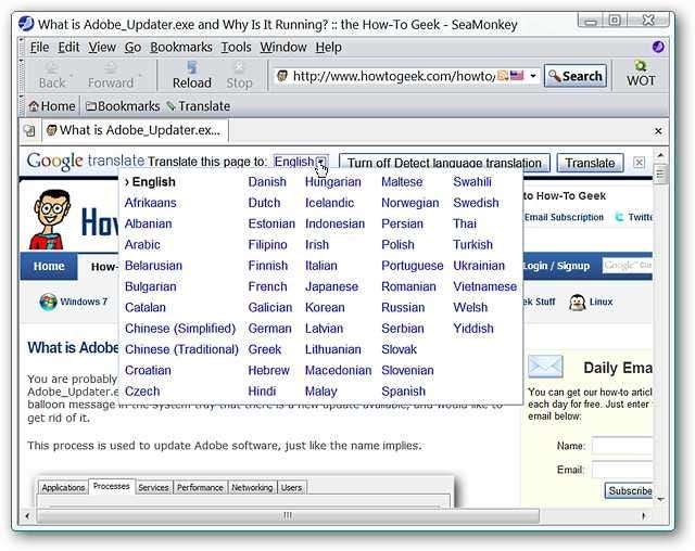 Wie zuvor wurde die Symbolleiste mit Englisch als Standardsprache für "Übersetzen in" angezeigt, als wir auf das Lesezeichen klickten.