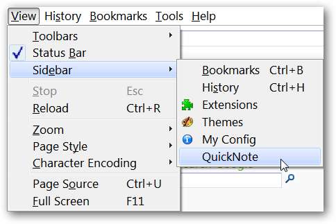 Nach der Installation der Erweiterung kann QuickNote über das Menü "Ansicht" für die "Sidebar-Version" aufgerufen werden oder ...