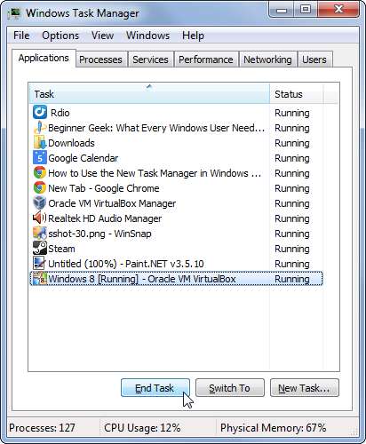 Unter Windows 7 wird der Task-Manager auf der Registerkarte Anwendungen geöffnet, auf der geöffnete Anwendungen aufgelistet sind und Sie sie mit der Schaltfläche Task beenden schnell schließen können. Dies funktioniert auch dann, wenn sie eingefroren sind und nicht reagieren.
