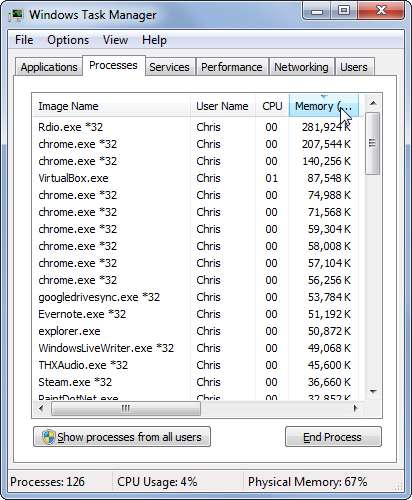 Klicken Sie auf die Überschrift CPU oder Speicher, um die Prozesse nach CPU- oder Speicherauslastung zu sortieren. Dies zeigt Ihnen, welche Programme die meiste CPU-Zeit und RAM-Größe verwenden.