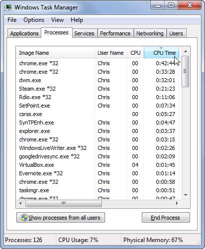 Möglicherweise möchten Sie auch auf das Menü Ansicht klicken, auf Spalten auswählen klicken und die Spalte CPU-Zeit aktivieren. Klicken Sie auf die Spalte CPU-Zeit, um die Liste nach CPU-Zeit zu sortieren. Dies zeigt Ihnen, wie viel CPU-Ressourcen jeder Prozess verwendet hat, sodass Sie Programme identifizieren können, die derzeit möglicherweise eine geringe Menge an CPU verwenden, aber eine höhere Menge an CPU verwendet haben, als Sie nicht gesucht haben.