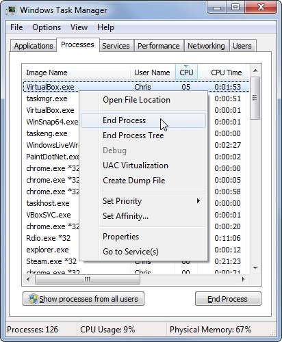 Wenn sich ein Prozess schlecht verhält - zum Beispiel haben Sie möglicherweise ein PC-Spiel geschlossen und es läuft im Hintergrund weiter, möglicherweise mit 99% Ihrer CPU -, zeigt die Sortierung nach CPU- und Speichernutzung, dass der Prozess, der sich schlecht verhält, zu viele Ressourcen verbraucht Oben auf der Liste. Klicken Sie mit der rechten Maustaste auf den Prozess und wählen Sie "Prozess beenden", um ihn zu schließen, wenn Sie ihn nicht normal schließen können.