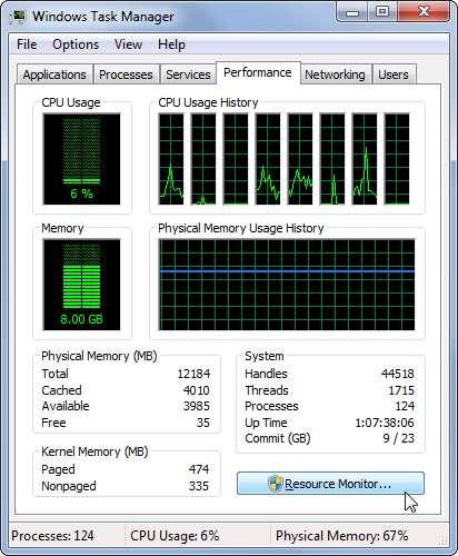 Wenn Sie sehen, dass Ihre Netzwerkverbindung verwendet wird, möchten Sie möglicherweise wissen, welche Anwendungen das Netzwerk verwenden. Um eine Liste der Prozesse anzuzeigen, die auf das Netzwerk zugreifen, und wie viele Netzwerkressourcen sie jeweils verwenden, klicken Sie auf die Registerkarte Leistung und dann auf die Schaltfläche Ressourcenmonitor.