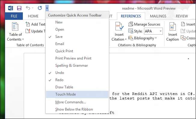 Klicken Sie auf die Symbolleiste für den Schnellzugriff anpassen und aktivieren Sie den Touch-Modus.