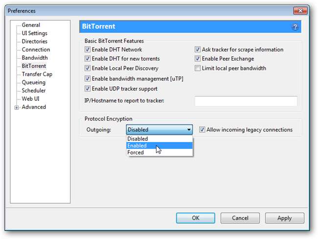 Dies ist jedoch keine perfekte Lösung. Die Verschlüsselung muss auch von Ihren Kollegen unterstützt werden, und ihre Clients können sie möglicherweise nicht verwenden. Einige Tracker erlauben nicht einmal die Verschlüsselung, aber wenn dies bei Ihnen der Fall ist, ist es keine schlechte Idee, diese zu aktivieren bevorzugen verschlüsselte Verbindungen, aber unverschlüsselte Übertragungen zulassen, wenn keine vorhanden sind.
