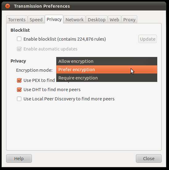 Eine Möglichkeit, diese Probleme zu beheben, besteht darin, die Verschlüsselung für Ihre Verbindungen zu aktivieren. Dies verhindert, dass die zwischen zwei Peers gesendeten Daten von den Zuschauern verstanden werden, verhindert jedoch nicht, dass sie ihre IP-Adressen oder bestimmte Details vom Tracker sehen, z. B. die übertragene Datenmenge.