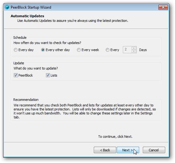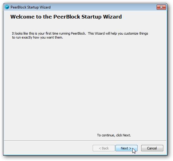 Die Installation ist ein Kinderspiel. Sobald der Vorgang abgeschlossen ist und Sie PeerBlock öffnen, wird der Konfigurationsassistent gestartet. Schlagen Nächster .