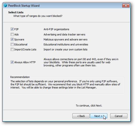 Auf diesem Bildschirm können Sie auswählen, welche Arten von Blocklisten Sie abonnieren möchten. Sie können hier sehen, dass wir gewählt haben P2P und warf auch Spyware ein. Wenn Sie mit solchen Dingen noch nicht vertraut sind, ist es wahrscheinlich am besten, sie zu wählen HTTP immer zulassen auch, da es den gesamten Verkehr durch diesen Port erlaubt. Wenn Sie diese Option nicht auswählen, kann das Surfen beeinträchtigt sein und Sie müssen bestimmte Websites manuell zulassen. Klicken Nächster wenn Sie fertig sind.0