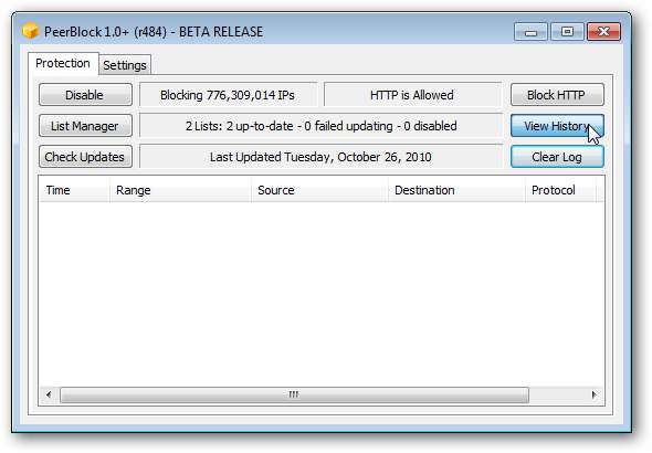 Sie werden mit dem PeerBlock-Hauptbildschirm begrüßt, auf dem Sie den Verlauf blockierter Versuche anzeigen können, auf Ihren Computer zuzugreifen, Ihre Listen zu verwalten, manuell nach Updates zu suchen usw. Sie können über das Symbol in Ihrer Taskleiste beenden.