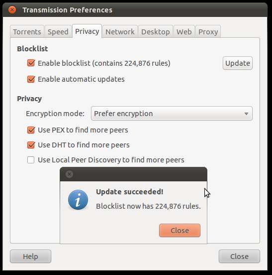 Klicken Sie auf die Häkchen neben Blockliste aktivieren und Aktivieren Sie automatische Updates Kästchen und klicken Sie dann auf Aktualisieren Taste. Die Übertragung lädt automatisch die P2P-Sperrliste herunter und verwendet sie. Außerdem wird die Gesamtzahl der Regeln angezeigt, die befolgt werden. Das ist es!