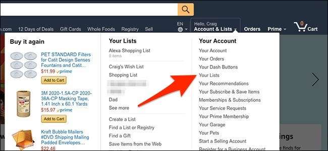 Nachdem Sie in Ihrem Amazon-Konto angemeldet sind, gehen Sie zunächst zu "Konten und Listen" und wählen Sie "Ihre Listen".