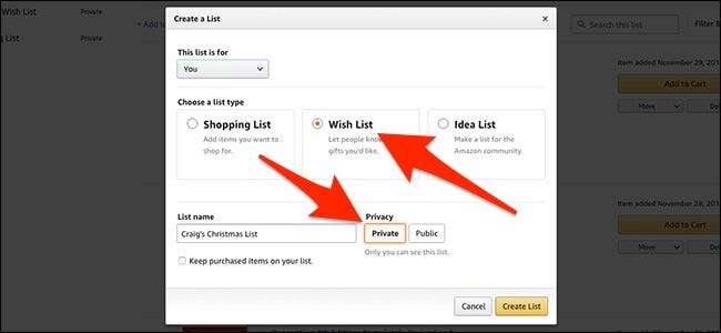 Wählen Sie als Nächstes "Wunschliste" und geben Sie der Liste einen Namen. Markieren Sie danach die Liste als "Privat".