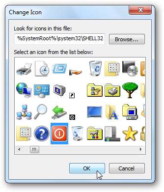 Daraufhin wird eine Liste der enthaltenen Windows-Symbole angezeigt, aus denen Sie auswählen können. Wählen Sie aus, was Sie möchten. Das Verzeichnis enthält einige Power-Symbole. Klicken Sie auf OK. Natürlich können Sie ein beliebiges Symbol auswählen. Wenn Sie Ihre Symbole anpassen, navigieren Sie einfach zu dem Verzeichnis, in dem sie sich befinden.