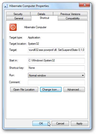 Jetzt sehen Sie das Symbol im Fenster Verknüpfungseigenschaften. Klicken Sie auf OK.