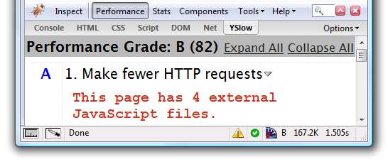 Die YSlow-Erweiterung ist eine neue Erweiterung von Yahoo, die Ihre Seite analysiert und Ihnen mitteilt, wo Sie Fehler machen. Sie erhalten sogar eine Bewertung der Leistung Ihrer Website. Sie werden das kleine Messgerät in der unteren rechten Ecke bemerken. Es zeigt Ihnen die Gesamtgröße Ihrer Seite sowie die Ladezeit. Sehr nützliche Erweiterung, erfordert jedoch die Firebug-Erweiterung.