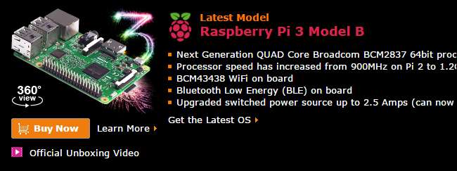 Es gibt mehrere Versionen des Pi, aber wenn Sie gerade erst anfangen, sollten Sie unbedingt die aktuellste Generation des Geräts kaufen - die Himbeer Pi 3 . Praktisch jedes alte Pi-Tutorial im Internet funktioniert immer noch mit den älteren Modellen, aber viele der Projekte, die Sie möglicherweise durchführen möchten (insbesondere, wenn Sie den Pi als Videospielemulator oder ähnliches verwenden möchten), profitieren wirklich von der neueren Hardware.