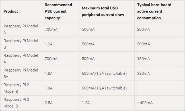 Hier ist ein Diagramm: Mit freundlicher Genehmigung der Pi Foundation , umreißt die vorgeschlagenen und minimalen Leistungsanforderungen.