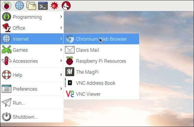 Klicken Sie auf dem Desktop auf das Raspberry Pi-Menüsymbol in der oberen linken Ecke und navigieren Sie zu Internet> Chromium-Webbrowser.
