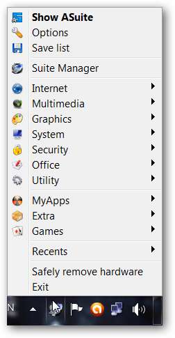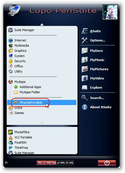Wenn die Suite aktiv ist, wird ein neues Taskleistensymbol angezeigt, das als Startmenüschaltfläche fungiert. Unten können Sie den verbleibenden Raum auf Ihrem Flash-Laufwerk überwachen und mit der Schaltfläche Schließen die Suite verlassen (möglicherweise basierend auf dem Menüthema als Ein- / Ausschalter angezeigt).