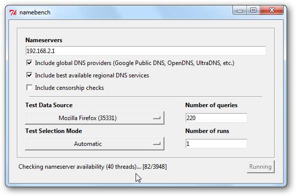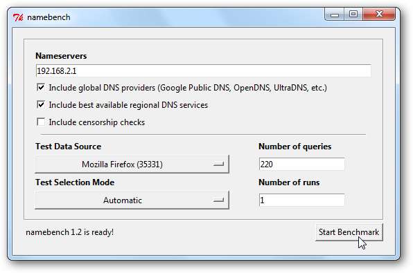 Namebench wird gestartet und enthält den aktuellen DNS-Server, den Sie auf Ihrem System konfiguriert haben. In diesem Beispiel stehen wir hinter einem Router und verwenden den DNS-Server des Internetdienstanbieters. Schließen Sie die globalen DNS-Anbieter und den besten verfügbaren regionalen DNS-Server ein und starten Sie den Benchmark.
