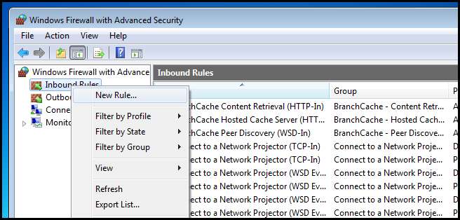 Um eine Regel zu erstellen, klicken Sie in der Konsolenstruktur mit der rechten Maustaste auf Eingehende Regeln und wählen Sie im Kontextmenü die Option Neue Regel….