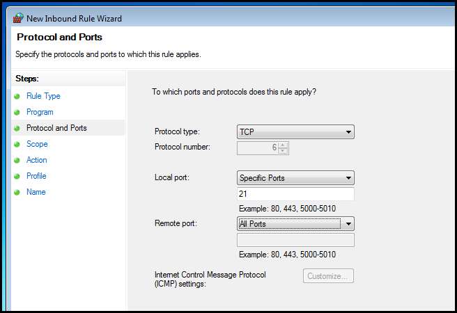 Jetzt müssen Sie die eigentliche Regel konfigurieren. Dies ist der wichtigste Teil des gesamten Assistenten. Wir werden eine TCP-Regel für den lokalen Port 21 erstellen, wie im folgenden Screenshot gezeigt.