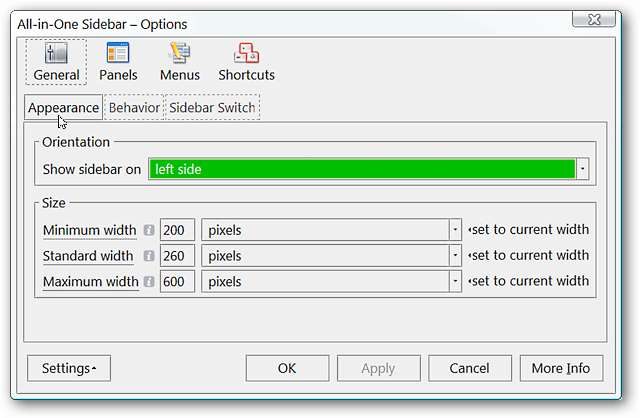 Entscheiden Sie auf der Registerkarte "Darstellung", auf welcher Seite des Browsers Ihre Seitenleiste aktiv sein soll, und geben Sie die genaue Breite in Pixel an.
