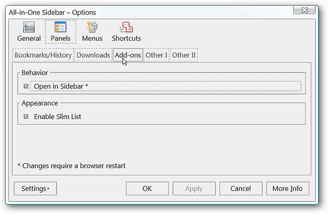 Sie können Add-Ons deaktivieren, die in der Seitenleiste angezeigt werden, wenn Sie das normale Fenster verwenden möchten, oder das Erscheinungsbild des regulären Stils anstelle des schlanken Listenstils aktivieren.