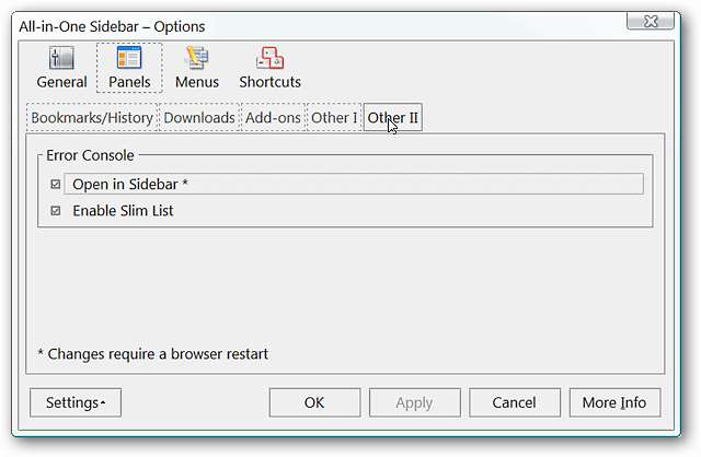 Entscheiden Sie, ob die „Fehlerkonsole“ auch in der Seitenleiste geöffnet werden soll und welchen visuellen Stil Sie auf der Registerkarte „Andere II“ bevorzugen.