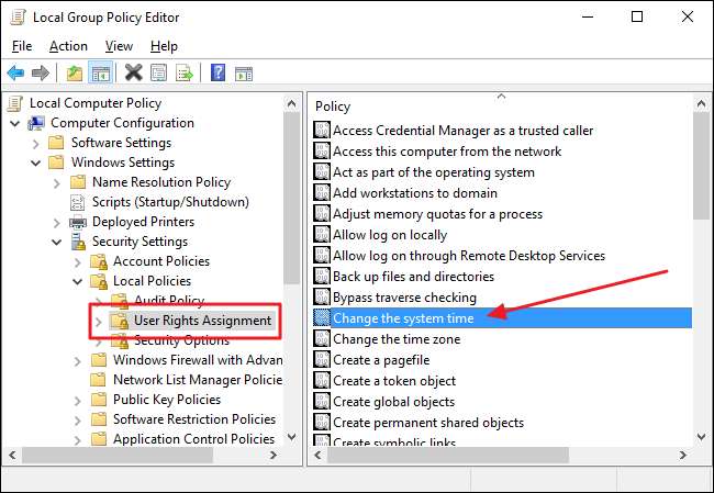 Melden Sie sich zunächst mit einem Administratorkonto an und öffnen Sie den Gruppenrichtlinien-Editor, indem Sie auf Start klicken, "gpedit.msc" eingeben und dann die Eingabetaste drücken. Führen Sie im Fenster Gruppenrichtlinien im linken Bereich einen Drilldown zu Computerkonfiguration> Windows-Einstellungen> Sicherheitseinstellungen> Lokale Richtlinien> Zuweisungen von Benutzerrechten durch. Suchen Sie rechts das Element "Systemzeit ändern" und doppelklicken Sie darauf.
