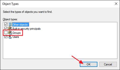 Aktivieren Sie im Fenster Objekttypen das Kontrollkästchen Gruppen, um es zu aktivieren, und klicken Sie dann auf OK.