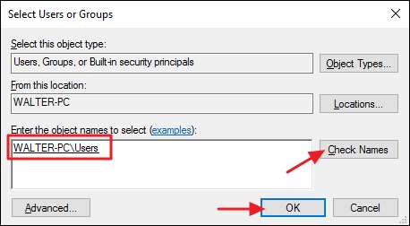 Geben Sie im Feld "Geben Sie die zu wählenden Objektnamen ein" "Benutzer" ein und klicken Sie dann auf die Schaltfläche "Namen prüfen". Windows prüft anhand verwendbarer Namen und füllt dann das Feld mit dem vollständigen Namen der Gruppe aus (<IhrPC-Name> \ Benutzer). Wenn dies erledigt ist, klicken Sie auf "OK".