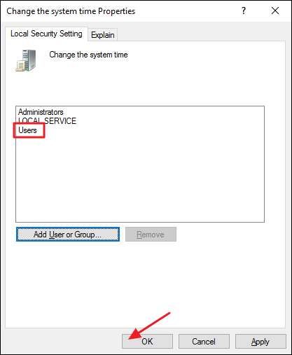 Zurück im Eigenschaftenfenster für die Systemzeiteinstellung können Sie sehen, dass die Benutzergruppe jetzt zur Berechtigungsliste hinzugefügt wurde. Klicken Sie auf OK, um die Einstellungen zu übernehmen und zum Gruppenrichtlinien-Editor zurückzukehren.