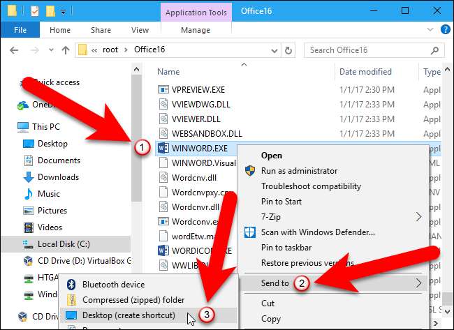 Klicken Sie mit der rechten Maustaste auf die Datei WINWORD.EXE und gehen Sie zu Senden an> Desktop (Verknüpfung erstellen).