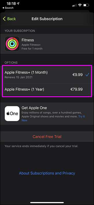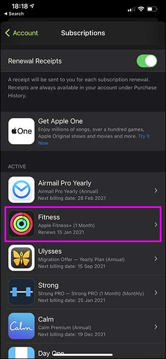 Sie sehen eine Liste Ihrer aktiven Abonnements. Tippen Sie auf "Fitness", wählen Sie dann entweder "Apple Fitness + (1 Monat)" oder "Apple Fitness + (1 Jahr)", je nachdem, welchen Sie sich ändern möchten. Bezahlen Sie mit Apple Bezahlen und Sie sind gut zu gehen.