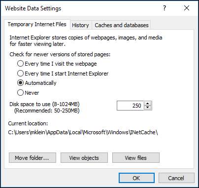 Im Dialogfeld "Website-Dateneinstellungen" können Sie anpassen, wann der IE auf der Registerkarte "Temporäre Internetdateien" nach neueren Versionen gespeicherter Seiten sucht, wie viel Speicherplatz für diese Dateien verwendet werden kann und wo sich dieser Ordner befindet. Sie haben auch die Möglichkeit, diesen Ordner und die darin enthaltenen Dateien anzuzeigen und bei Bedarf an einen anderen Speicherort zu verschieben.