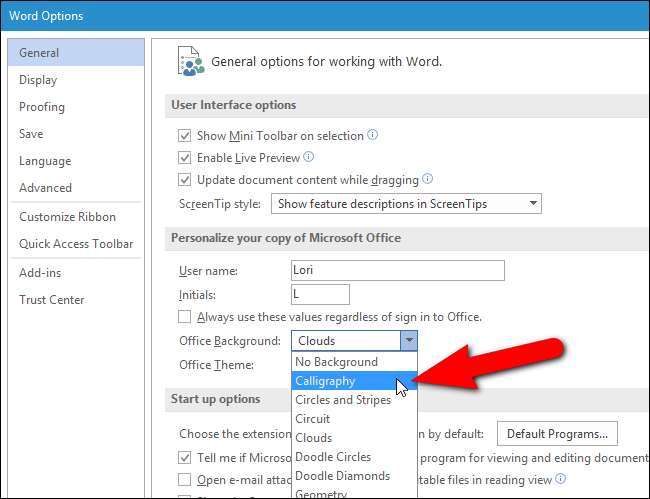 Der Bildschirm Allgemein wird standardmäßig angezeigt. Wählen Sie auf der rechten Seite im Abschnitt Personalisieren Ihrer Kopie von Microsoft Office eine Option aus der Dropdown-Liste "Office-Hintergrund" aus. Wenn Sie kein Hintergrundbild in der Titelleiste wünschen, wählen Sie "Kein Hintergrund".