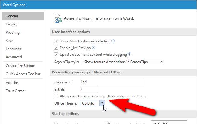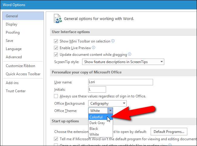 Um das Farbthema zu ändern, wählen Sie eine Option aus der Dropdown-Liste „Office-Design“ aus. Die Themen Dunkelgrau und Schwarz sind jetzt als dunkle Themen verfügbar. Das schwarze Thema steht jedoch nur Office 365-Abonnenten zur Verfügung. Das bunte Thema hat in jedem Programm eine andere Farbe, z. B. Blau in Word, Grün in Excel und Orange in PowerPoint.