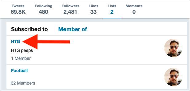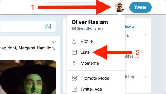 Um eine Ihrer Listen anzuzeigen, klicken Sie oben rechts auf Ihr Profilbild twitter.com Klicken Sie anschließend im Dropdown-Menü auf "Listen". Die Schaltflächen "Profil" und "Listen" befinden sich links, wenn Sie die mobile App verwenden.